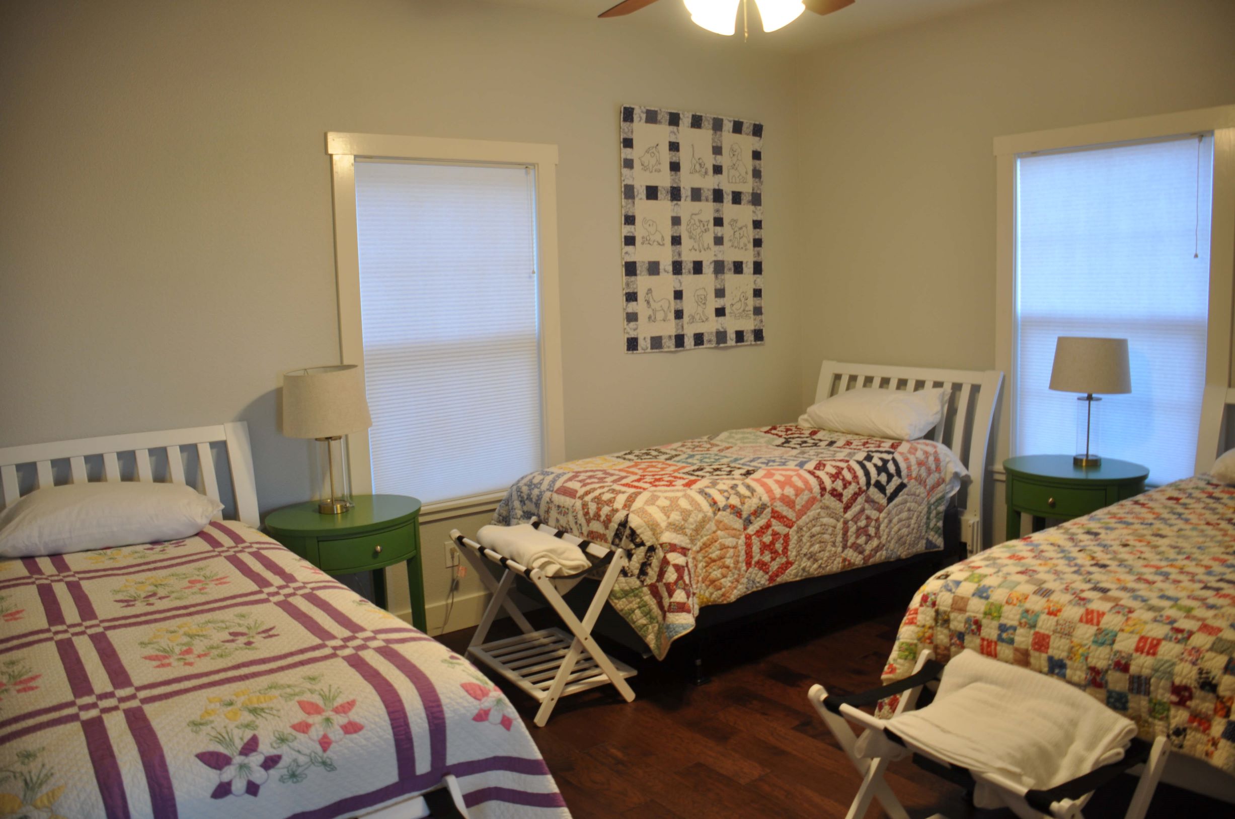 We remodeled our barn into additional accomodations. The Barn has a full kitchen, dining and living areas, two bedrooms, one with three twin beds and one with two twin bed, a shared bath and half-bath, and a large front porch looking over the Pedernales Valley. Lunch or dinner is served in the main dining area. A washer/dryer is available for washing fabric.