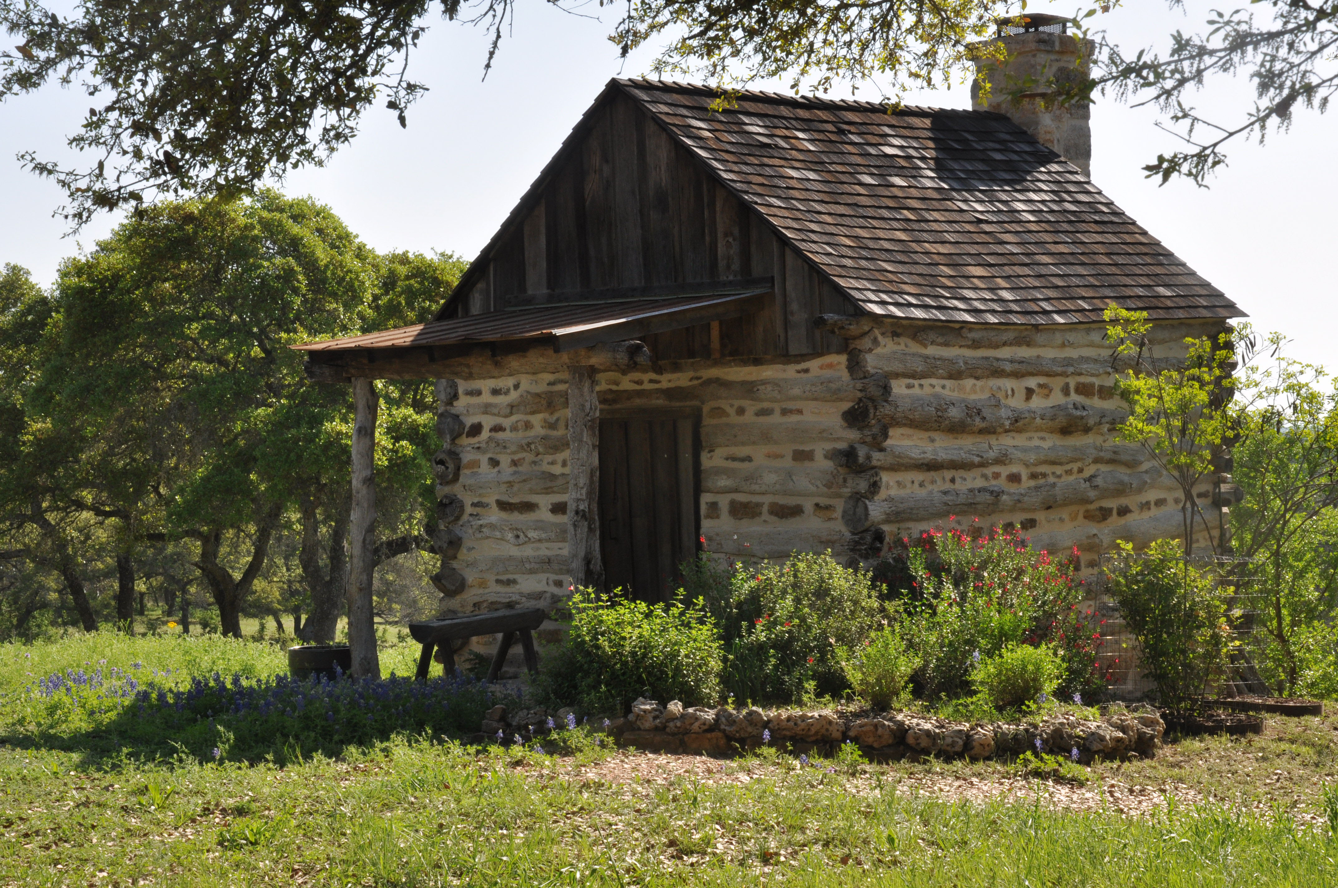 The log cabin is a typical hill country first house. It is composed of post oak logs (which are straighter than live oak logs), chinking (rocks and limestone mortar), wood shingles, and a beautiful limestone fireplace.