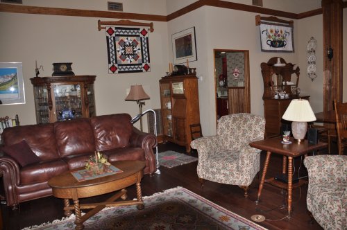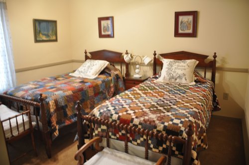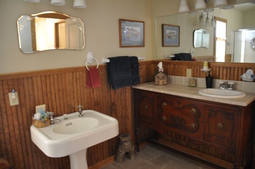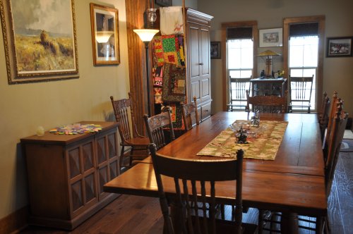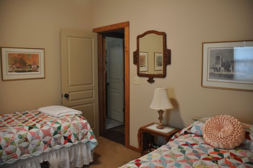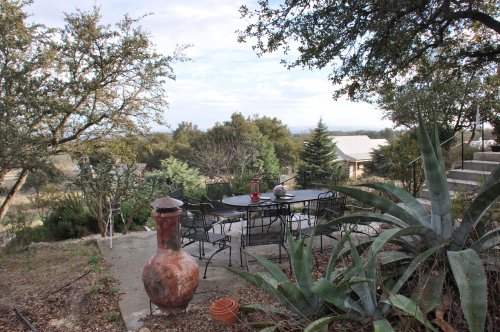 The Main Haus has a full kitchen, dining and living areas, two bedrooms with twin beds and a shared bath, and a large front porch looking over the Pedernales Valley. Lunch or dinner is served in the main dining area. A washer/dryer is available for washing fabric.